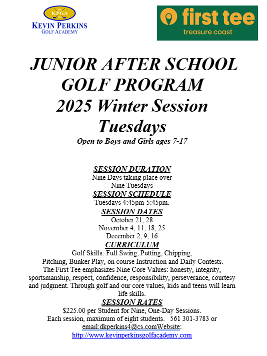 Questions? Contact Kevin Perkins Golf Academy at [email protected] or (561) 301-3783 or http://www.kevinperkinsgolfacademy.com/
